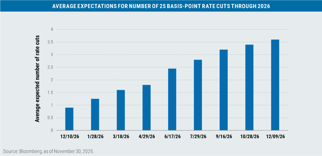 As for interest rates, investors currently foresee up to four additional rate cuts by the Federal Reserve in 2026 as part of an expected effort to maintain a steady labor force and in anticipation of continued improvement on the inflation front.