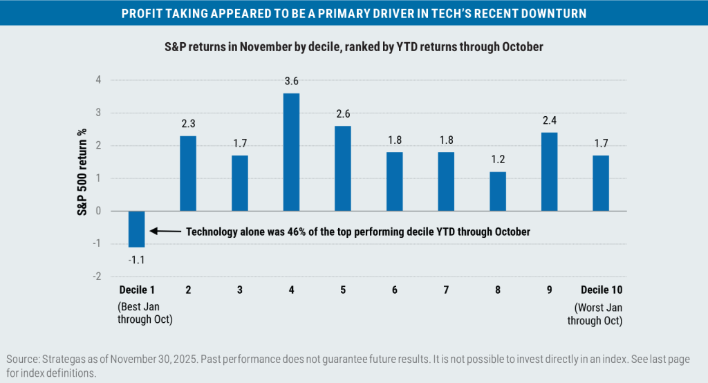 The S&P 500 Index was able to keep its winning streak alive (barely) in November, posting a return of 0.25% for its seventh consecutive monthly gain, a feat that was last accomplished in 1995. The benchmark needed a gain in the final week of the month—and got one of 3.74%—to offset an intra-month pullback of -4.68% that was largely driven by year-end tax loss harvesting in combination with taking gains in year-to-date winners, many of which were names that had traded higher in the artificial intelligence (AI) “arms race.”