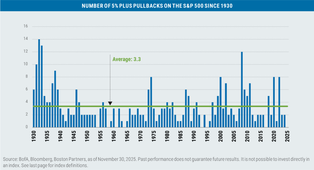 While there are no obvious near-term warning signs* for the stock market that are readily observable in our crystal ball, we remain wary that a pullback in stock prices (5% or more) can happen at almost any time—and historically, has happened on average 3.3 times a year, or roughly every 110 days. Despite the seven-month winning streak—or perhaps because of it—investors shouldn’t get too accustomed the market moving in only one direction.