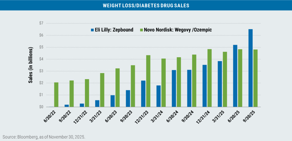 For the second month in a row, we saw strength in the Health Care sector, led primarily by pharmaceutical companies rather than medical device companies or health insurers. Eli Lilly was the top performing stock in the Health Care sector during November with a return of 24.82% and contributed 35% of the sector’s overall return, helped by the success of the company’s Zepbound weight loss drug.